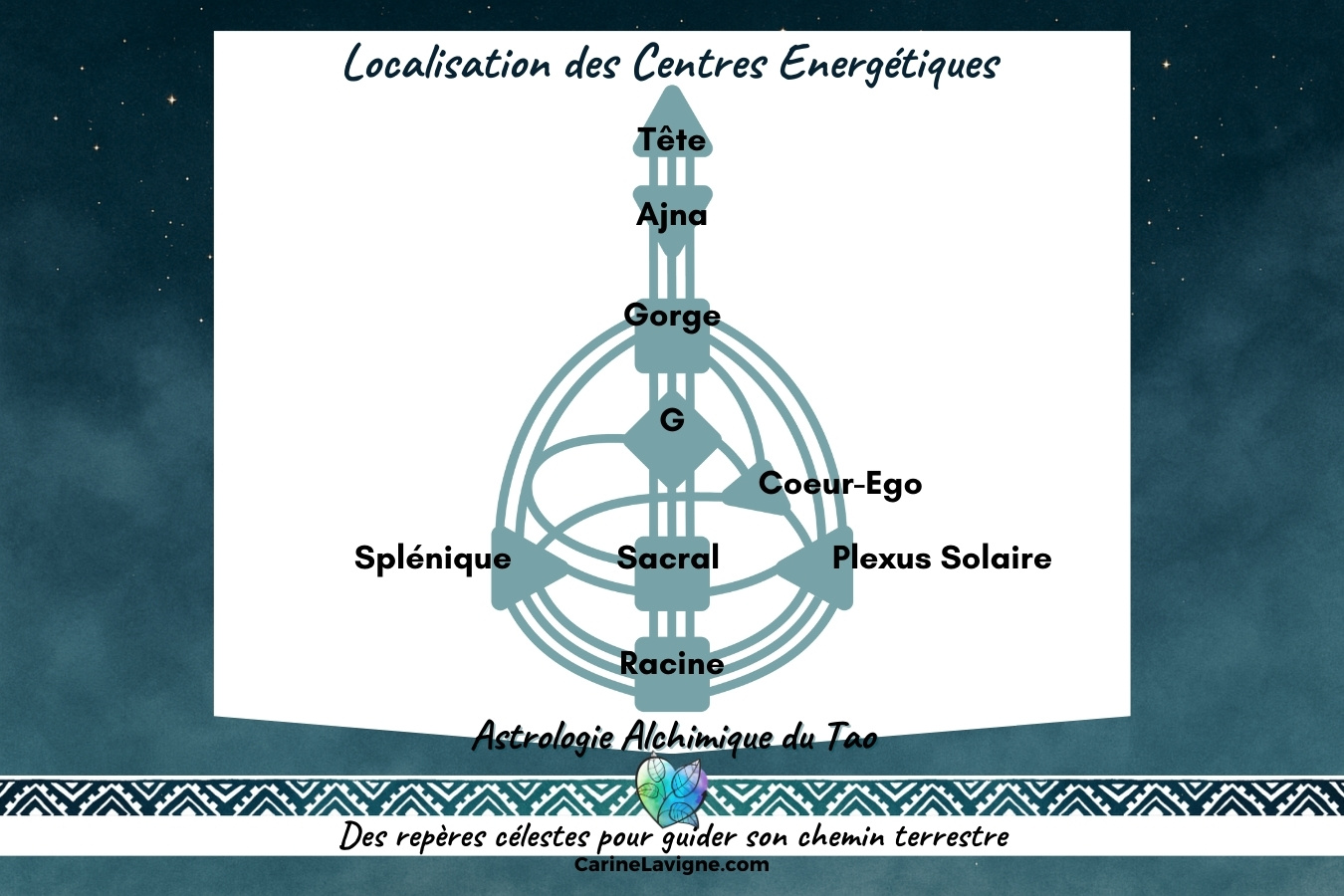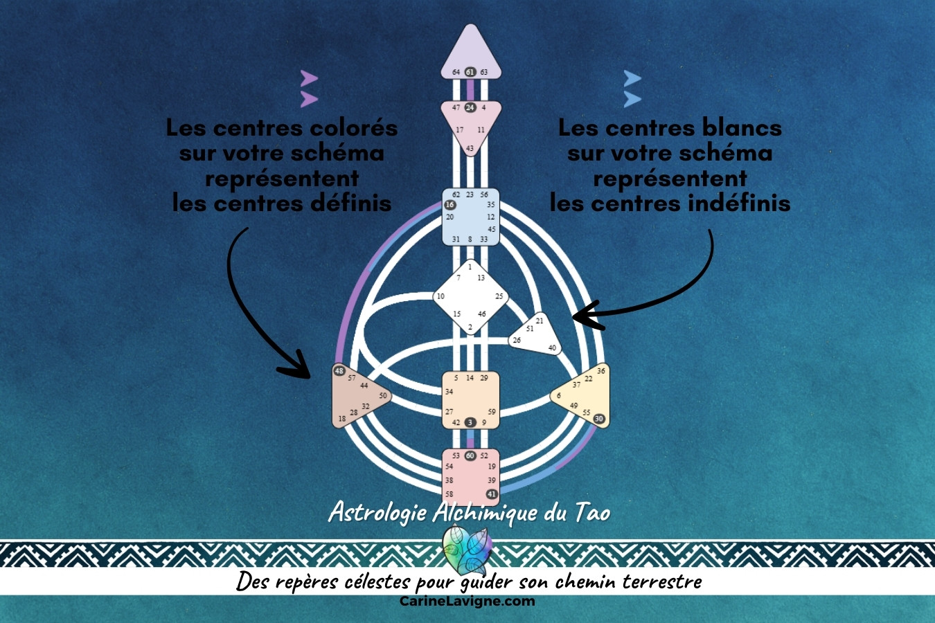 Au cœur de cette carte se trouvent neuf centres énergétiques, chacun représentant un aspect clé de notre être : les émotions, l’esprit, l’intuition, la volonté, etc. Ces centres peuvent être définis (fixes et constants) ou non définis (ouverts et influencés par l’extérieur).