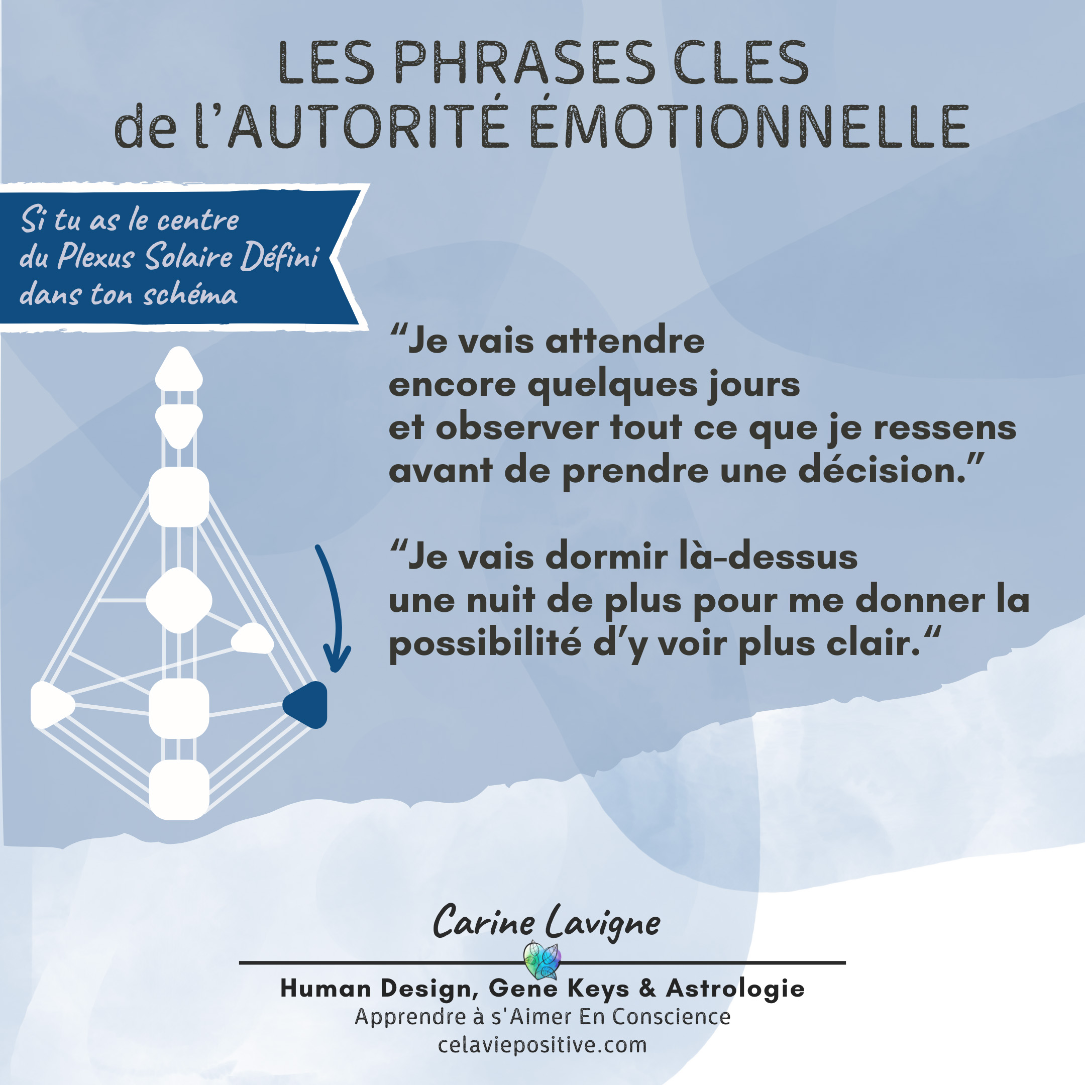 Essayez de différer votre prochain choix important pour constater si votre perspective évolue. Si vous constatez que prendre de meilleures décisions arrive plus souvent quand vous prenez tout votre temps. C’est que vous avez probablement une autorité intérieure émotionnelle.